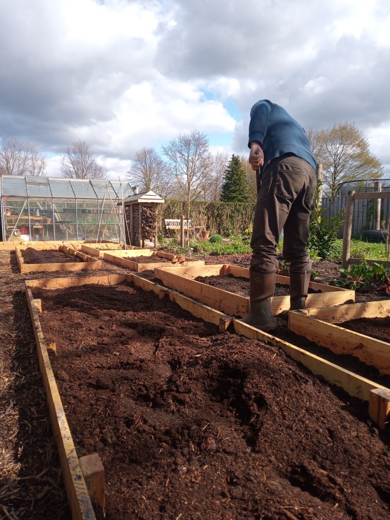 Omdat we de grond in onze kas echt heel leeg en dood vonden – en we met het maken van de bedden ook wel wat extra’s konden gebruiken – hebben we twee keer een kuub compost laten komen van Bio Kultura, van Kwekerij van Houtum. Hier zijn we echt heel blij mee. Onze grond is best prima, zit vol met wormen en ziet er goed en gezond uit. Maar op een paar plekken groeit er heel veel kruipende boterbloem en dat zou wijzen op een slechte bodemstructuur. Dus die compost kan geen kwaad! We kozen voor een mengsel, half mestcompost en half boomschorscompost. Het is een flinke investering maar hopelijk wel een waar we veel profijt van zullen hebben. En de service was heel goed. Ik kreeg de tip van @moestuin_mama, zij is super leuk om te volgen op instagram. Zeker als je jonge kinderen hebt en samen lekker aan de slag wil buiten.