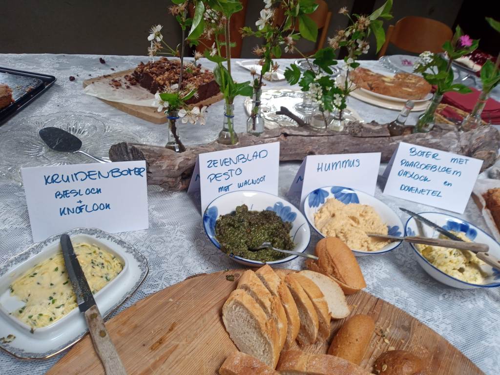 De zevenblad pesto en paardenbloem kruidenboter (allebei met daslook) die een van de andere vrijwilligers had gemaakt waren heerlijk. Zevenbladpesto heb ik thuis nu ook uitgeprobeerd want we hebben meer dan genoeg zevenblad in de tuin, en die was ook echt heel lekker. Dus dat is een blijvertje! Zo leuk dat ik nu eindelijk iets met de daslook heb gedaan die al een paar jaar in de tuin staat. Het lijkt altijd zo veel werk zulke dingen, maar als je bezig bent is het eigenlijk zo klaar. Ik vind het gewoon lastig denk ik om er aan te beginnen, zeker wanneer ik het nog nooit gedaan heb.