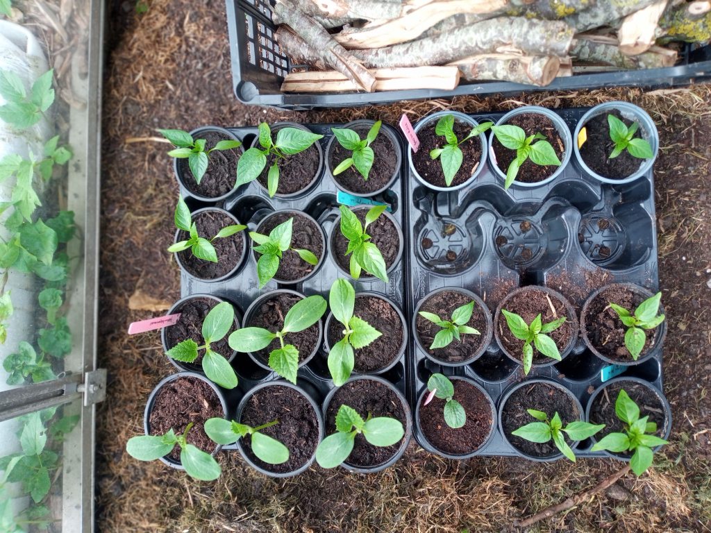 Een hele tijd had ik geen zin om aan de moestuinvoorbereidingen te beginnen, en het weer hielp daar dan ook niet echt aan mee. Maar uiteindelijk moest ik toch wel gaan beginnen met voorzaaien, want anders zou er helemaal niets van terecht komen dit jaar. Dus ik ben een beetje aan de late kant met alles, maar dat geeft niet. De courgettes staan inmiddels in de grond, ’s nachts nog wel wat extra bescherming vooral tegen de slakken. En de eerste tomaten ook uitgeplant in de kas. Sonneherze, ik ben heel benieuwd hoe dat er uit gaan zien, als het goed is vlammend rood oranje. Ik heb ook een heeeeeleboel stekjes oude tomatenrassen, uit een zadenmix die ik bestelde via de Velt zaden samenaankoop en die ik iets te enthousiast heb voorgezaaid, omdat mijn tomaten het vorig jaar zo slecht deden. Daarnaast heb ik ook nog coeur de boeuf van onze lieve vrienden in Frankrijk en een groen gestreepte vleestomaat die ik meenam van de lokale Velt plantjesruildag. Dus ik denk wel dat ik met zekerheid kan zeggen dat ik teveel tomatenplanten heb dit jaar. De plantjesruildag was wel ontzettend leuk. Een paar leuke dingen (wolmunt, ik had er nog nooit van gehoord, en een zwarte bes, een hele kleine druif en nog wat bloeiende dingen voor in de border) mee naar huis genomen in ruil voor wat ik zelf had opgekweekt of uit mijn tuin geschept.