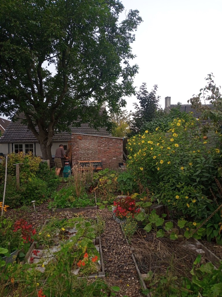 Andere klusjes die we deden in augustus: een enorme berg snoei afval verwerken tot houtsnippers, heel veel courgettes oogsten, op tijd de tomaten opbinden zodat het eens niet zo’n enorme chaos werd in de kas en verder werken aan de garage, ons (inmiddels langetermijn) bouwproject. Als alles goed gaat kan deze herfst/winter het dak erop en kan ik volgend jaar de oogst, al dan niet geweckt, in een mooie geïsoleerde ruimte opslaan! Tot slot nog maar een foto…of twee 😉