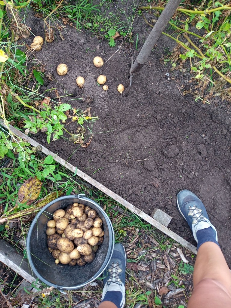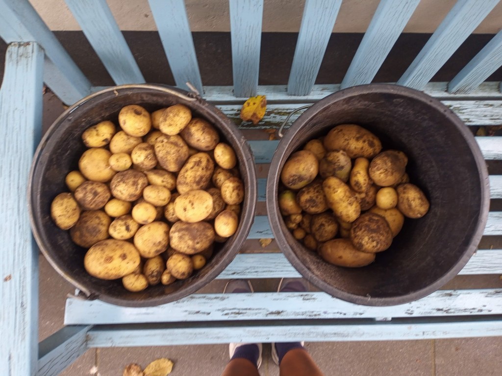 Tijdens het schrijven van de blog van juli werd ik onderbroken en vervolgens vergat ik hem af te maken. Inmiddels is het september! Ik wil iets schrijven over pompoenen, de tuin opruimen, en andere najaarsdingetjes, maar dit blogbericht zat nog in mijn concepten dus laat ik die maar gewoon afmaken! Het wordt een soort ‘zomer in vogelvlucht’-verhaal. In augustus gingen we op vakantie, vlak daarvoor de aardappelen geoogst want de ruggen begonnen in te storten. Misschien van de rare combinatie van droogte en stortbuien. Het waren niet zo veel aardappelen als afgelopen jaren, maar ik ben ook niet ontevreden.